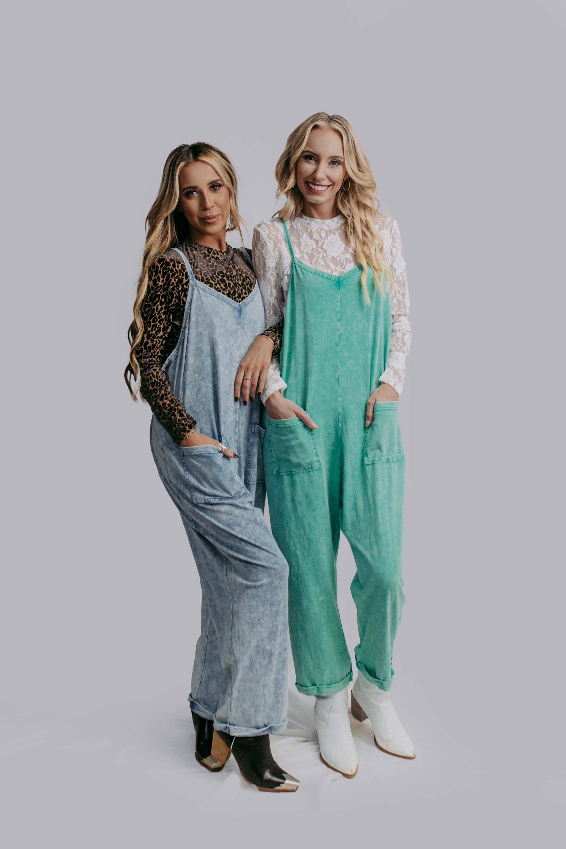 This acid-washed blue jumpsuit features a relaxed, vintage-inspired silhouette, perfect for a casual yet trendy look. The fabric has a soft, slightly faded finish with unique, abstract patterns created by the acid-wash technique, giving it a one-of-a-kind appearance.